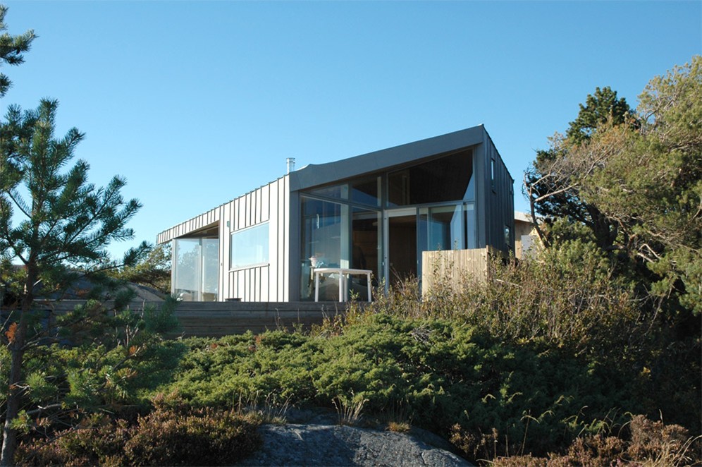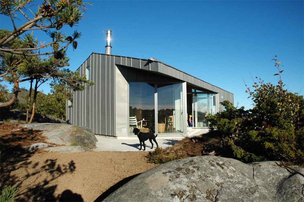 Located at a windswept peninsula, the cabin replaces an older structure from the 50's.The volumetric composition is dictated by the old structure and the slope of the site, together with a wish to create quiet nooks protected from the wind.The interior is finished with a polished concrete floor close to the granite in color and experiential quality. Walls are clad in oak. The zink clad exterior echoes the color of the granite site. |