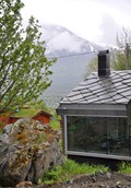 The family house is placed on the upper part of the sloped site, offering great views towards the south. An annex is placed on the lower part of the plot with a courtyard formed between the two. Both buildings are timber log structures placed on an elevated base wall of concrete. This foundation wall is elevated in order to handle the height differences in the surrounding terrain. The buildings combine traditional vernacular log techniques with a modern architectural expression. This really comes to show by using large glass surfaces mounted between the knots of the log structure. Interplay between glass-framed parts and the log structure arises - creating varied spaces. The mai shape of the two houses has a clear reference to the formal language of the traditional building style, both in terms of volume and the angle of the roof. The interior wood is treated with a grey color with contrasting colored furniture.