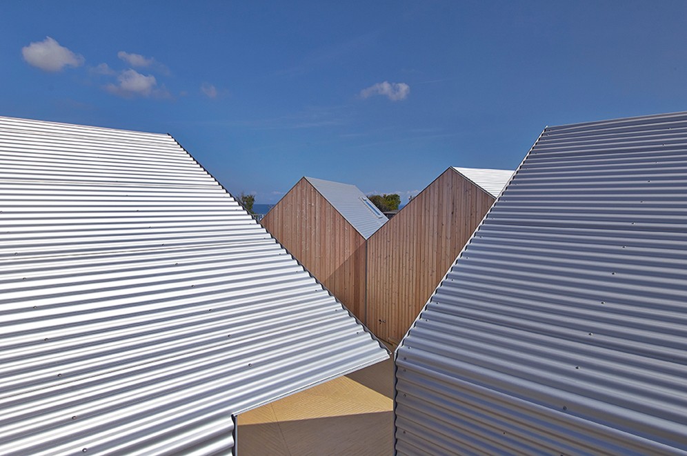 The ridge and cornice of the houses are on the same height, while the width and length vary. This gives the roofs different angles, making a playful composition in relation to the surrounding summer houses. The inner courtyard is clad with a darker stone on the floor and walls to store heat from the day throughout the evening. |